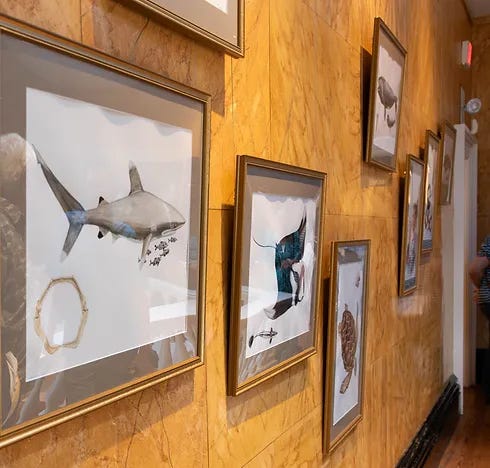 Around that time artist Jennifer Nolan reached out to Molly about showcasing her work at the museum. Jen depicts coastal creatures using watercolors, acrylic, and other media like gold and silver. She conjures up connections to humans with relatable titles such as Mommy and Me for a work featuring an alligator and her offspring, and Self Reflection for a work featuring an ibis seemingly gazing at itself in water.